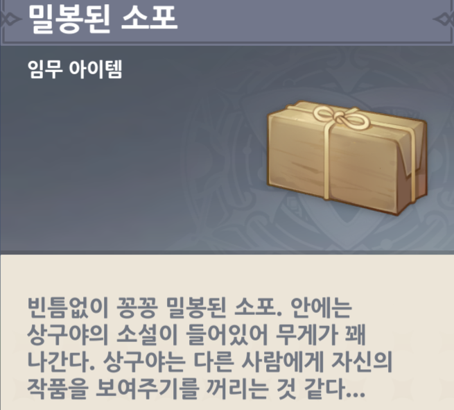 획득 방법 : 일일 퀘스트 「이 소설 대단해!」 진행 중 소포를 몰래 보면 획득