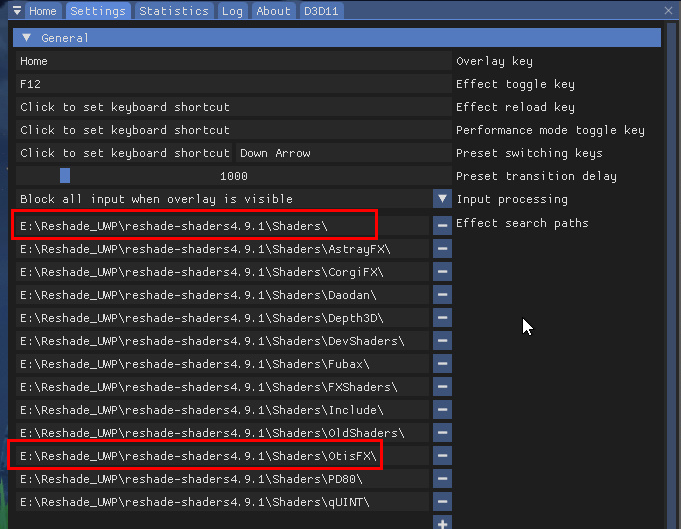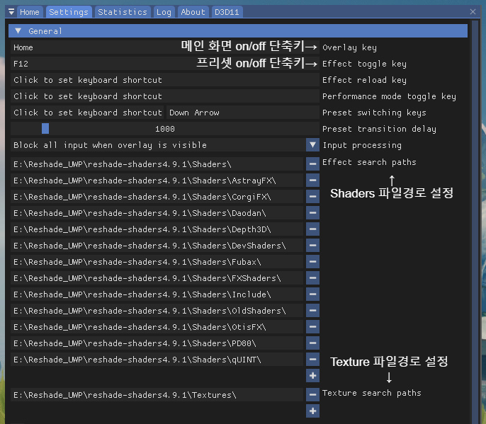 위 사진 예시대로 reshade-shaders4.9.1안의 폴더를 경로로 두면 됨( 팩트 : 안 쓰는게 반도 넘는다 )