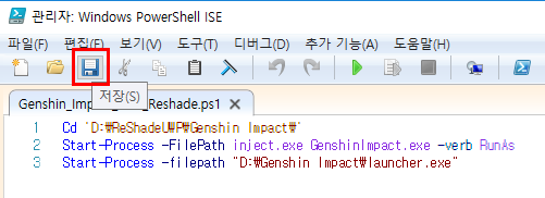 1번은 Genshin_Impact_with_Reshade.ps1가 있는 폴더경로를 복붙해주고