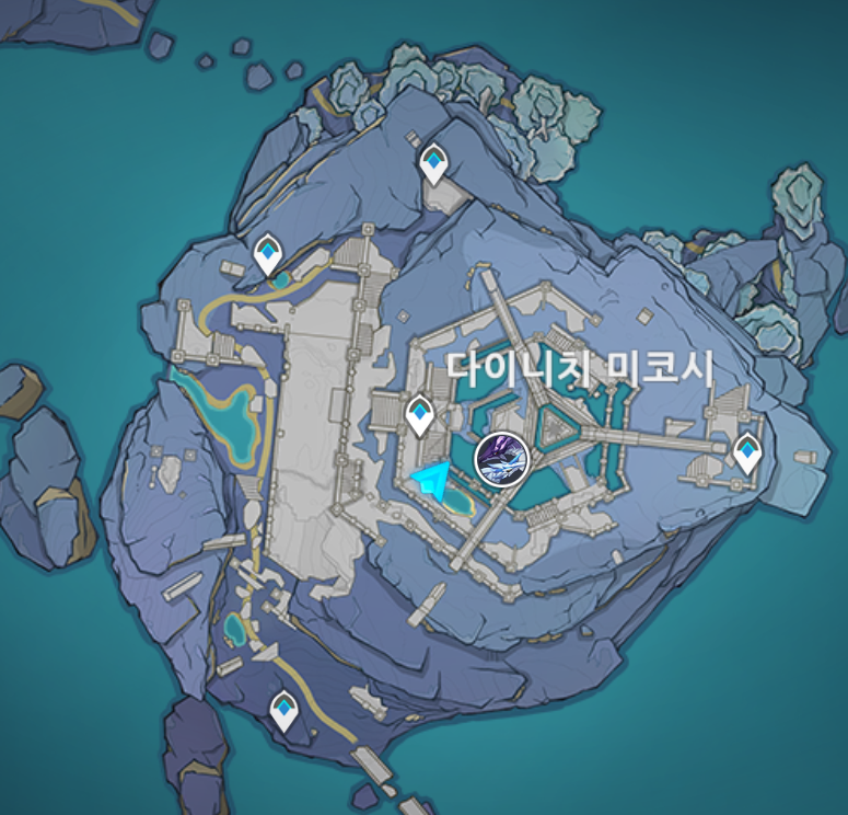원신초기 지도에는 없던 북두의 배와 같이 지도상에는 없는 곳으로 가야한다. 아래 타이니치 미코시 섬에 가장 가까운 포탈에서 뛰어내려서 가면 됨. 섬 끄트머리로 가면 포탈이 있는데 포탈을
