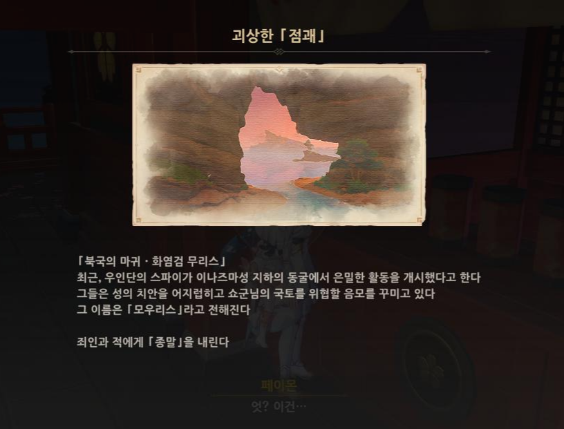 원신 히든업적 SYUUMATSU GAIDEN 월드 퀘스트 특별한 점괘 2일차. 여전히 이상한 반응. 2일차도 1일차와 똑같이 점괘 뽑고 풀이해달라고 하면 된다. ★ 2일차 극악무도한 도적 쥐 요괴 마키 마키타 우