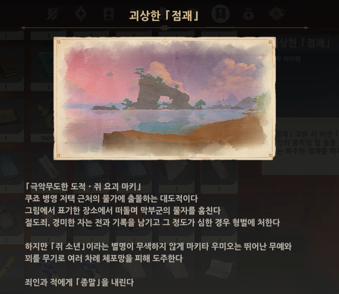 원신 히든업적 SYUUMATSU GAIDEN 월드 퀘스트 특별한 점괘 4일차. 이젠 말하지도 않은 이름을 알고 있다. 역시나 똑같이 점괘 뽑고 풀이 후 임무 수행. ★ 4일차 참귀의 킨 위치는 야시오리섬 왼쪽 해