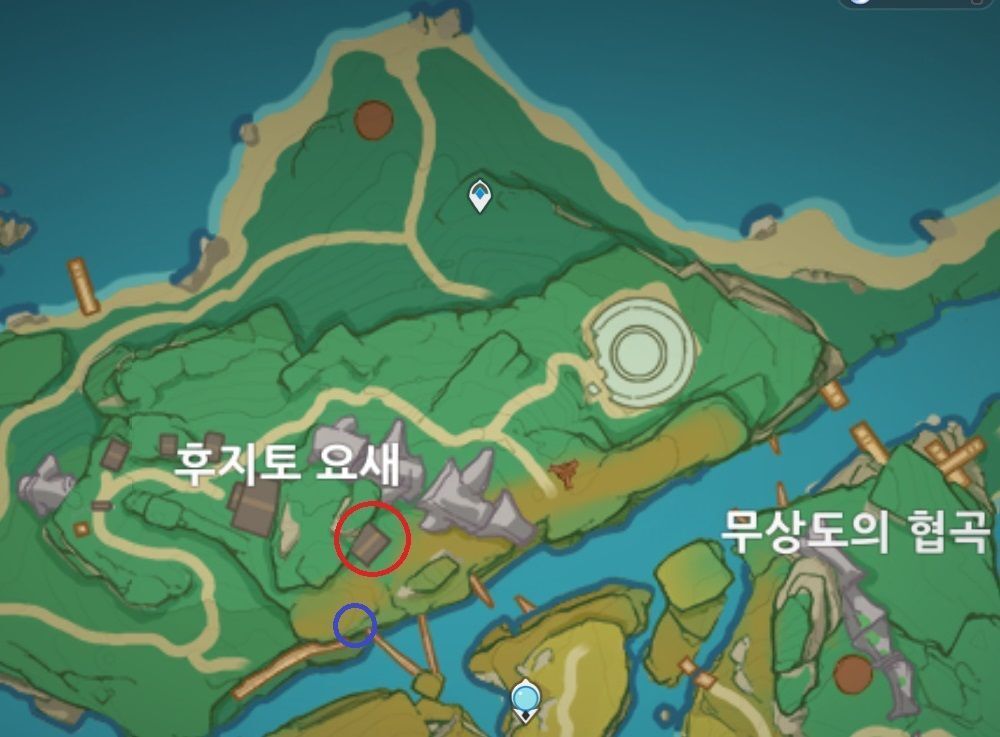 파란 원 그린 부분이 최초 야스모토랑 대화하는 곳, 빨간 원 부분이 야스모토네 집