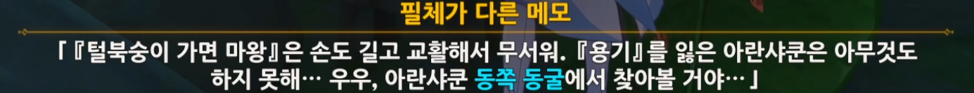 원신 히든업적 용기를 찾는 사처럼... 아란샤쿤이 잃어버린 「용기」 찾기 신비한 스크랩북 1번을 발굴하고나면 나머지가 열리는데 가다보면 페이몬이 주절거린다. 그럼 월드 퀘스트가 생김.